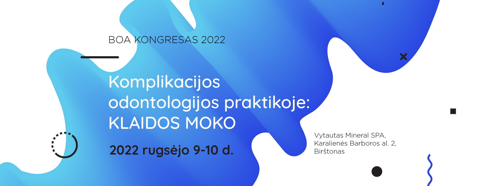 2022 m. rugsėjo 9-10 dienomis susitiksime Birštone BOA kongrese 2022 „Komplikacijos odontologijos praktikoje: klaidos moko”. Komplikacijos yra nemaloni, tačiau neišvengiama gydytojo praktiko darbo dalis, apie kurią dažnai vengiama kalbėti viešai. Šią tendenciją pasistengs pakeisti savo patirtimi sutikę pasidalinti geriausi savo srities profesionalai. Pirmąją kongreso dieną savo