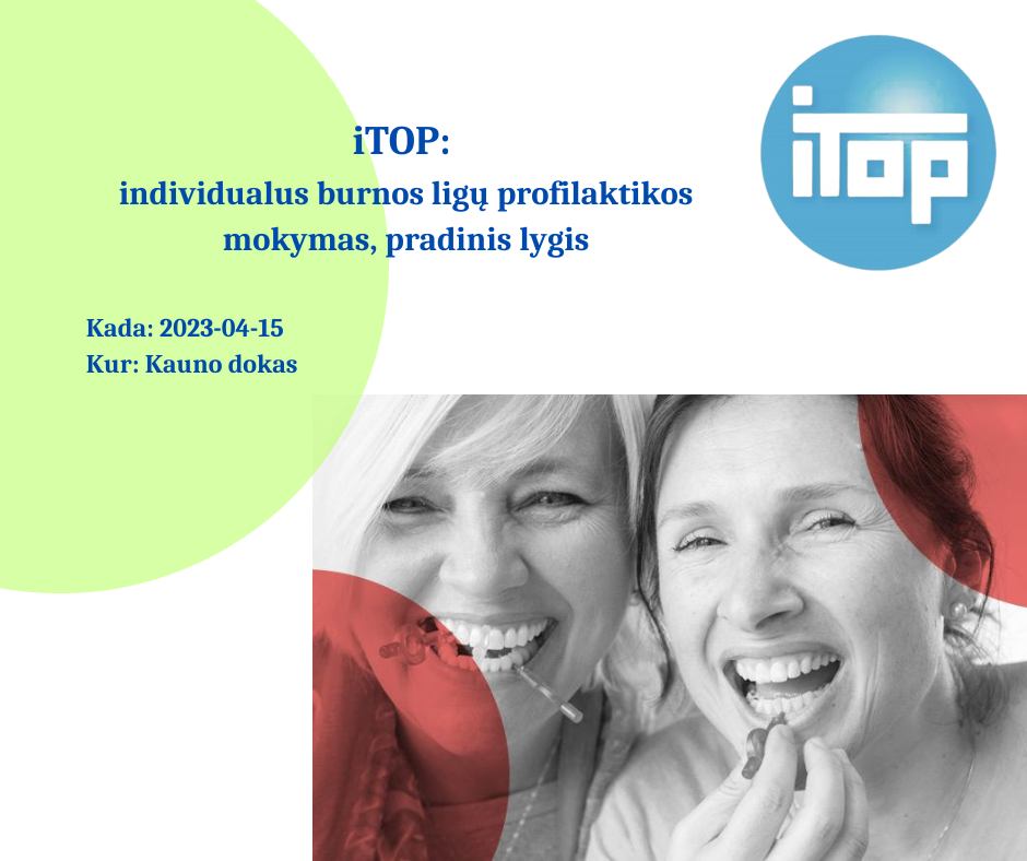 iTOP: individually Trained Oral Prophylaxis – individualus burnos ertmės ligų profilaktikos mokymas, kurio tikslas išsaugoti savus-natūralius dantis visą gyvenimą.