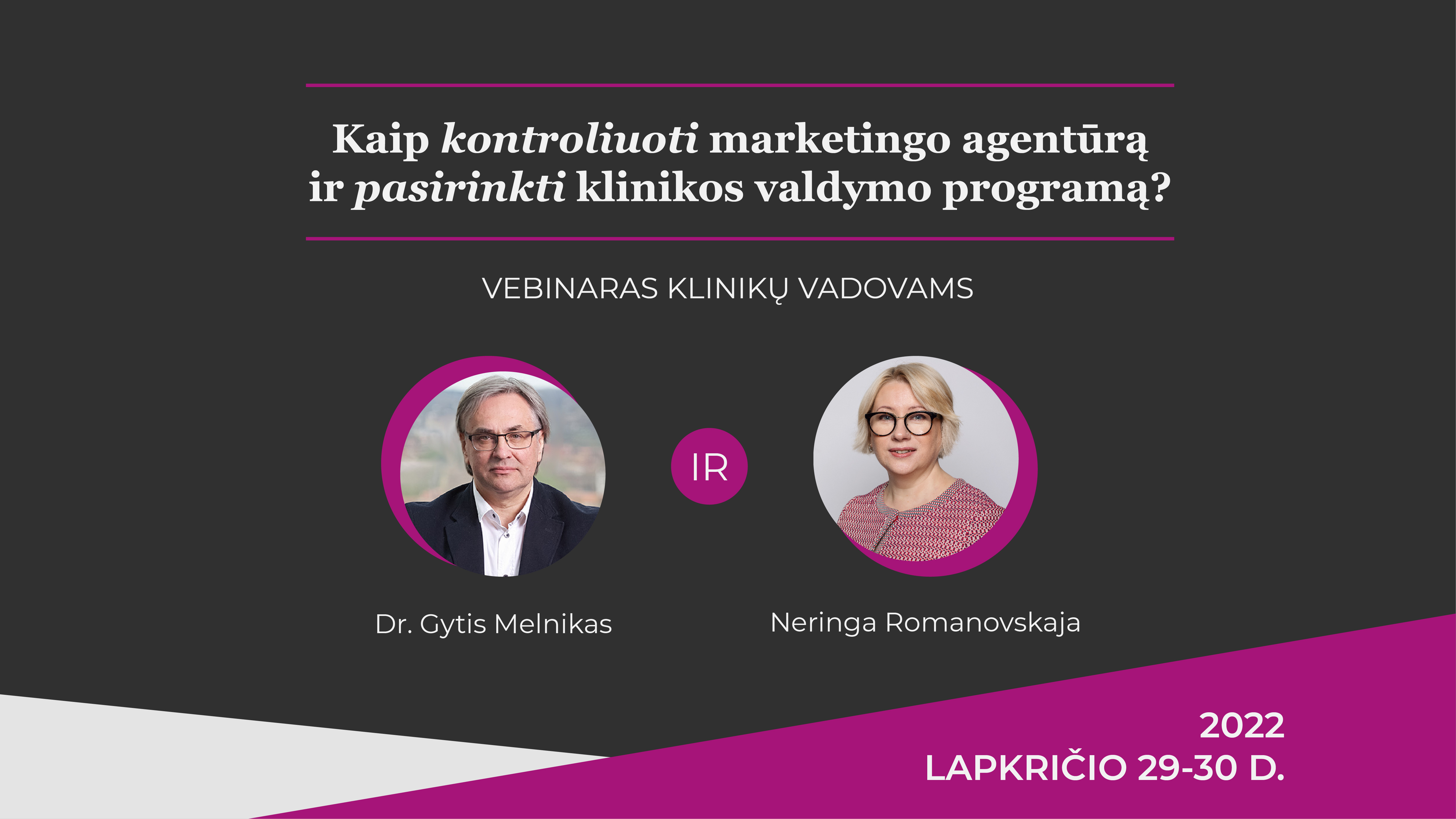 Klinikų vadovus kviečiame į vebinarą – diskusiją su dviem ekspertais – Gyčiu Melniku, PhD ir Neringa Romanovskaja. Vebinaras vyks 2022 m. lapkričio 29 – 30 d., 18:00 – 20:00 val.