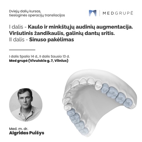 Kviečiame stiprinti žinias Med. m. dr. Algirdo Puišio dviejų dalių kurse „Kaulo ir minkštųjų audinių augmentacija. Viršutinis žandikaulis, galinių dantų sritis“ ir „Sinuso pakėlimas”, vyksiančiame spalio 14 d. (I dalis) ir sausio 13 d. (II dalis).
