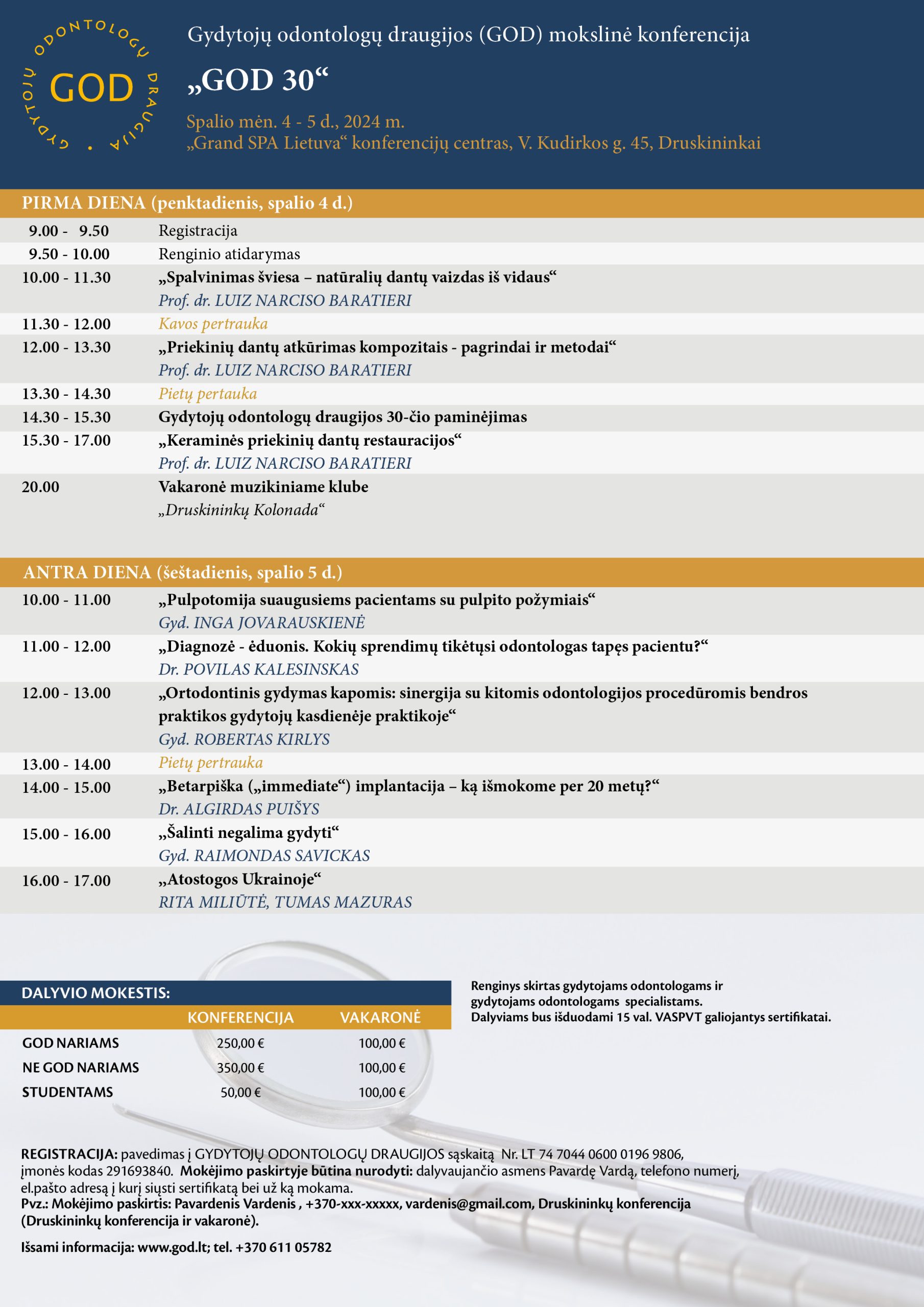 Gydytojų odontologų draugijos 30-mečio proga su paskaitų ciklu atvyksta vienas iš žymiausių pasaulinio lygio lektorių, pranešimų bei vadovėlių apie tiesiogines ir netiesiogines estetines bei funkcines restauracijas pradininkas, legendinis Prof. LUIZ NARCISO BARATIERI