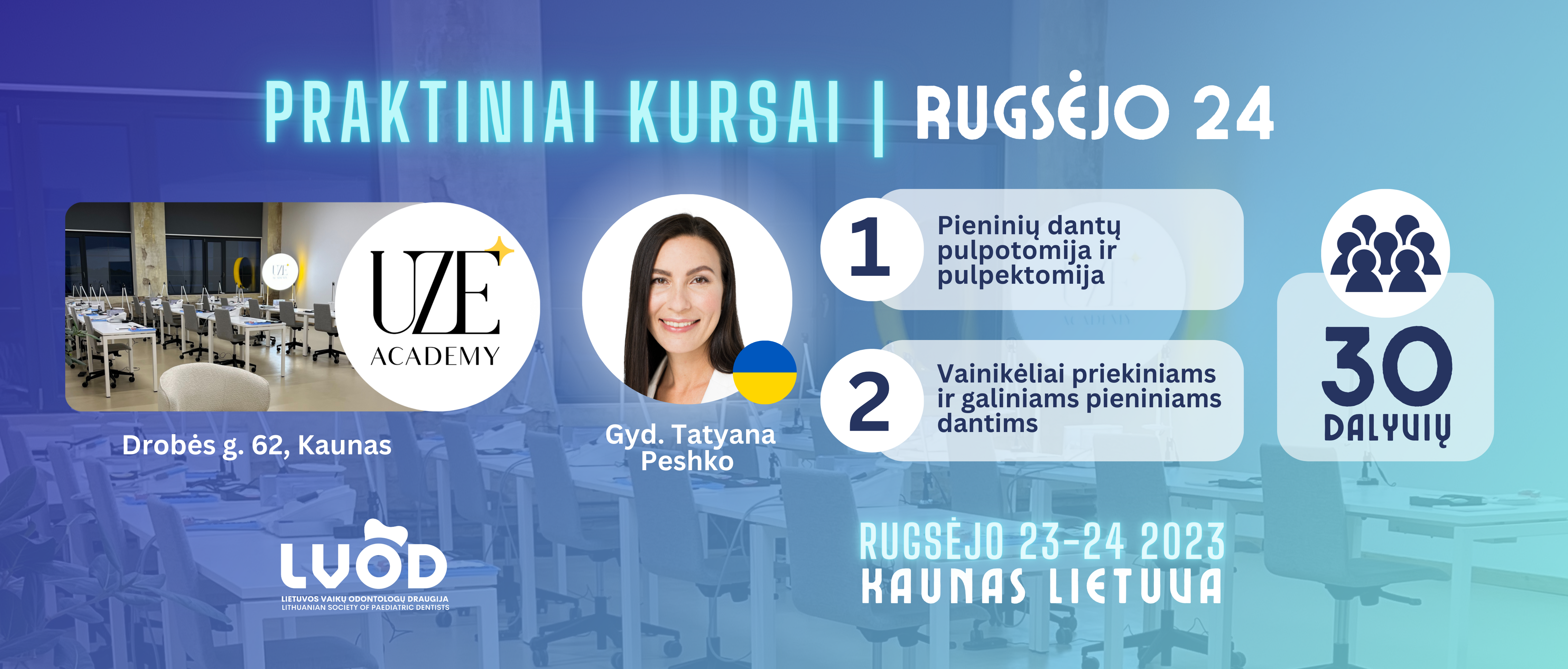 Praktinio kurso metu dalyviai ugdys pieninių dantų pulpotomijos ir pulpektomijos bei protezavimo standartiniais cirkonio ir nerūdijančio plieno vainikėliais įgūdžius.