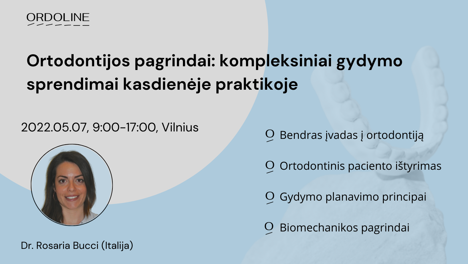 Kviečiame dalyvauti vienos dienos mokymuose su garsia tarptautine lektore iš Italijos gyd. Rosaria Bucci. Šis įvadinis kursas skirtas visiems specialistams, kurie domisi ortodontija ir nori įgyti pagrindinių teorinių šios srities žinių. Šio kurso metu dalyviai: