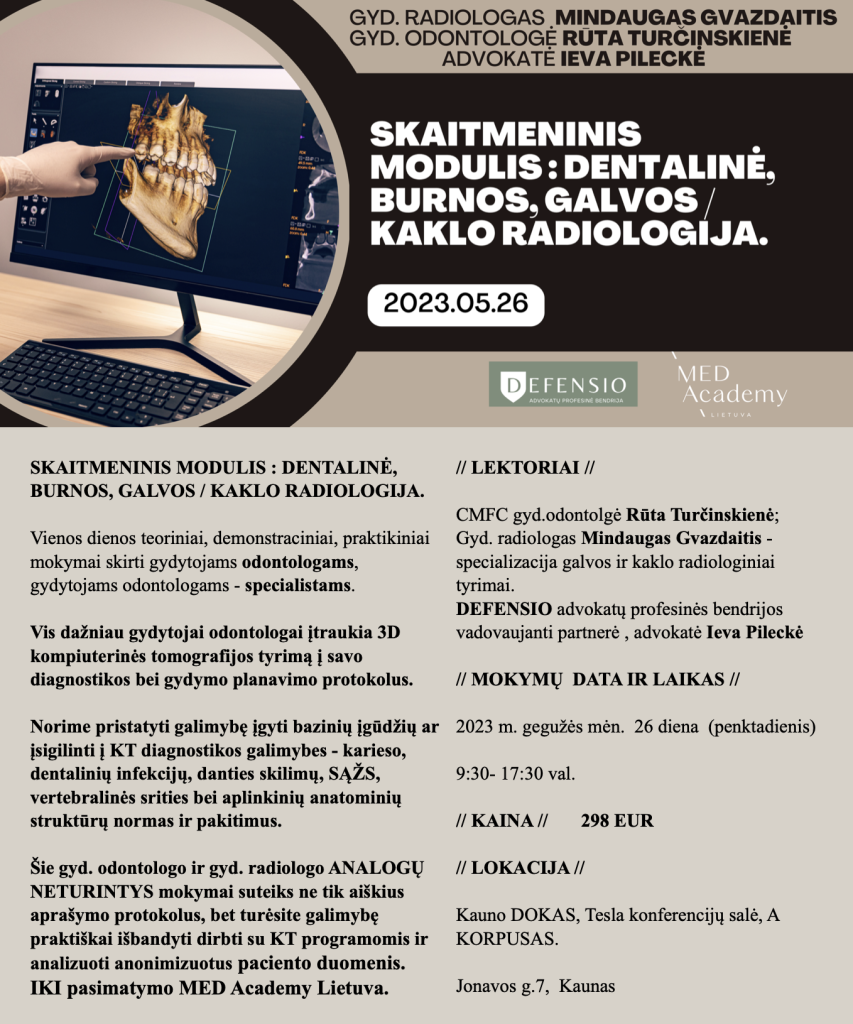 11.15 – 12.45 Dentalinių struktūrų, SĄŽS ir kitų galvos ir kaklo anatominių elementų anatomija ir radiologinio vertinimo norma. Skirtingų klinikinių atvejų demonstracija.