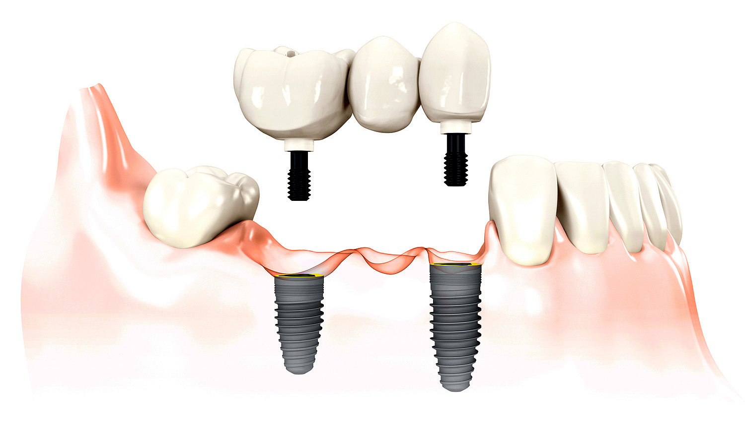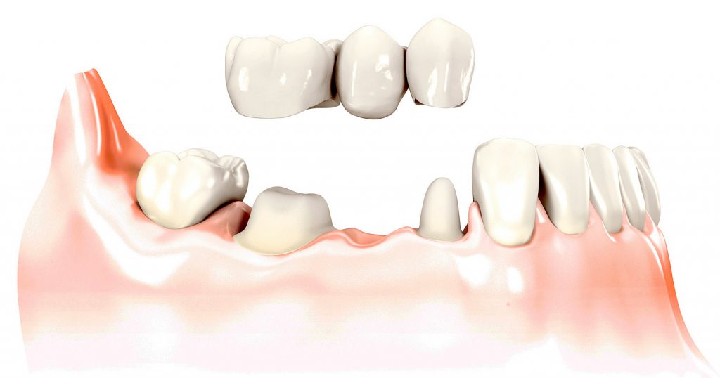 Nelikus nė mažiausių dantų likučių ir atsisakius dantų implantų, tenka gaminti dantų tiltą – dirbtinį dantuką plius du šoninius vainikėlius dantuko tvirtinimui ant nušlifuotų kaimyninių savų dantų.