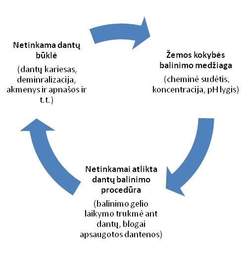 Mokslininkai patvirtino, kad dantų balinimo procedūra, kai ją atlieka ne dantų priežiūros specialistas, nėra saugi (Rotstein, 2008; Minoux, 2008; Sulieman, 2008, ADA, 2010). Bet dauguma žmonių susidomi pasiūlymais įgyti Holivudo vertą šypseną už mažesnę kainą. Tačiau rezultatas gali ne tik nepateisinti lūkesčių, bet ir tapti negrįžtamu pažeidimu. Taip gali nutikti dėl kelių priežasčių. Pirma, dėl dantų būklės (kariesas, emalio demineralizacija, apnašos, akmenys, pralaidžios restauracijos) balinimo procedūros metu. Antra, dėl balinimo produkto kokybės (cheminė sudėtis ir jų koncentracijos). Ir trečia, kaip atlikta pati balinimo procedūra (kiek laiko laikomas gelis ant dantų; ar gerai apsaugotos dantenos). Dėl šių išvardintų priežasčių labiausiai nukenčia burnos gleivinė ir atsiranda dantų struktūros pokyčių. Jei procedūros metu yra blogai apsaugotos dantenos, jos gali sudirgti, nudegti ar išsivystyti uždegimas (ADA, 2010; Goldberg,2010; Li, 2011). Pagrindiniai dantų pažeidimai, kurie kenkia ir estetiniam vaizdui, atsiranda dėl balinimo produktų, kurių sudėtyje yra žemas pH lygis, emalio demineralzacijos, gelio perdozavimo, sumažėjusio emalio atsparumo ir kt. (Cubbon, 1991; Hammel, 1998; ADA, 2010). Taip nutinka, nes vandenilio peroksidas, kuris yra pagrindinė daugumos dantų balinimo gelių sudedamoji dalis, gali būti citotoksinis ir dirginantis, jei jo koncentracija yra aukšta (ADA, 2010; Li, 2011).